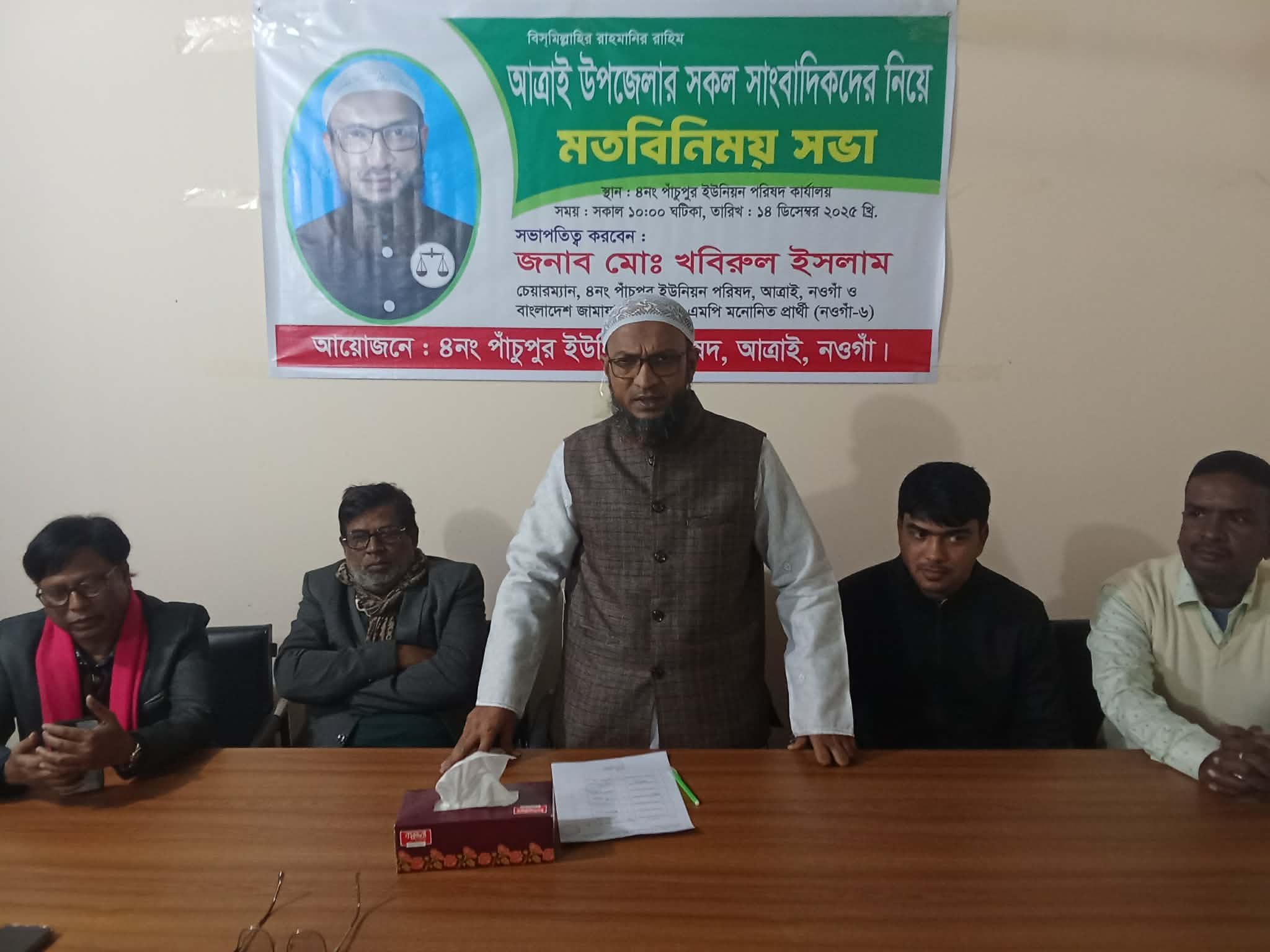 মতবিনিময় সভায় মো. খবিরুল ইসলাম বলেন, আমি আত্রাই উপজেলার পাঁচুপুর ইউনিয়ন পরিষদের বর্তমান চেয়ারম্যান হিসেবে দায়িত্ব পালন করে আসছি। আমি ত্রয়োদশ জাতীয় সংসদ নির্বাচনে নওগাঁ-৬ আসনের বাংলাদেশ জামায়েত ইসলামের এমপি পদপ্রার্থী। কিন্তু নির্বাচন পরিপত্রে জানানো হয়েছে যে এক সঙ্গে দুই জায়গায় কাজ করা যাবে না। তাই এমপি পদপ্রার্থীর জন্য চেয়ারম্যান পদ থেকে স্বেচ্ছায় অব্যাহাতি নিয়ে আপনাদের সাথে নিয়ে আত্রাই রাণীনগর উপজেলায় উন্নয়ন মূলক কাজ করতে চাই।