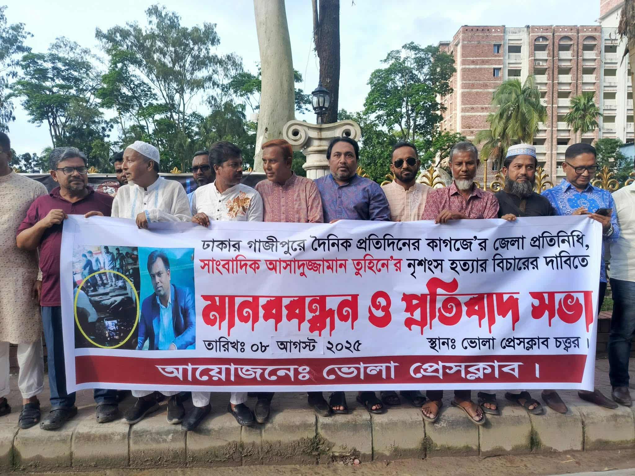 শুক্রবার (৮ আগস্ট) বিকেলে ভোলা প্রেসক্লাবের আয়োজনে প্রেসক্লাব চত্তরে এই মানববন্ধন ও প্রতিবাদ সমাবেশে অনুষ্টিত হয়েছে।