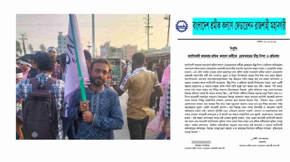 গতকাল শনিবার (১০ জানুয়ারি) এক বিবৃতিতে এ প্রতিবাদ জানানো হয়। বিবৃতিতে সংগঠনের রাজশাহী মহানগর সভাপতি অধ্যাপক আব্দুস সামাদ ও সাধারণ সম্পাদক আব্দুল মালেক বলেন, রাজপাড়া থানা পুলিশ বাংলাদেশ শ্রমিক কল্যাণ ফেডারেশন রাজশাহী মহানগরীর কর্মী চাঁদ সওদাগর, মুরাদ ও বিদ্যুৎকে তাদের নিজ নিজ বাসা থেকে গ্রেপ্তার করেছে। পরে উদ্দেশ্যমূলকভাবে অস্ত্র উদ্ধারের ‘নাটক’ মঞ্চস্থ করা হয়েছে বলে তারা দাবি করেন।